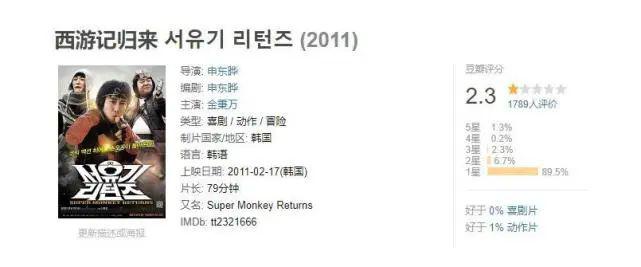 2011 年的《西游记归来》,把故事背景设定在了现代。大饼脸孙悟空既矮且肥,跟八戒傻傻分不清楚,剧情烂到看完都能申请 " 工伤 ",连 " 烂片中的战斗机 " 都不足以形容其雷人程度,有网友吐槽是 " 恐怖片 "。