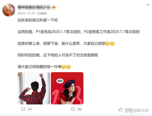 而且今年跨年的时候,肖战和杨紫工作室都是卡在零点发文,肖战穿了红色格子衬衫,杨紫则穿的红色格子裙。
