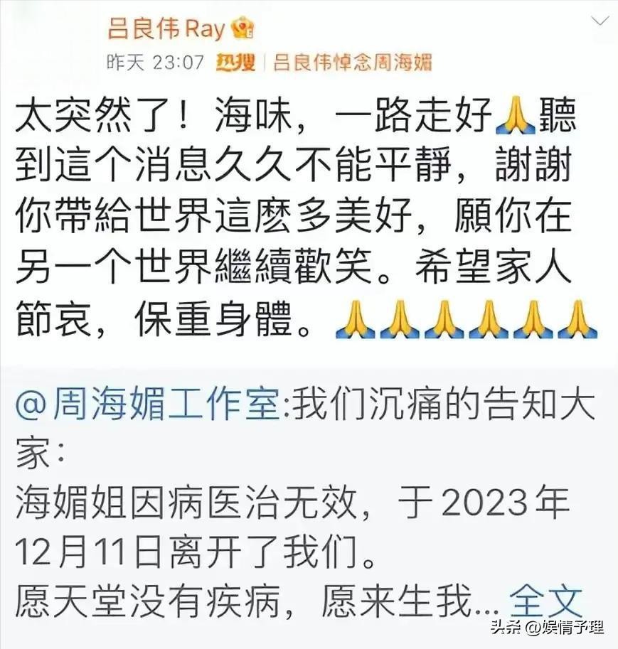 2023年12月11日,周海媚因病离世,吕良伟也发文悼念,字里行间都是遗憾。