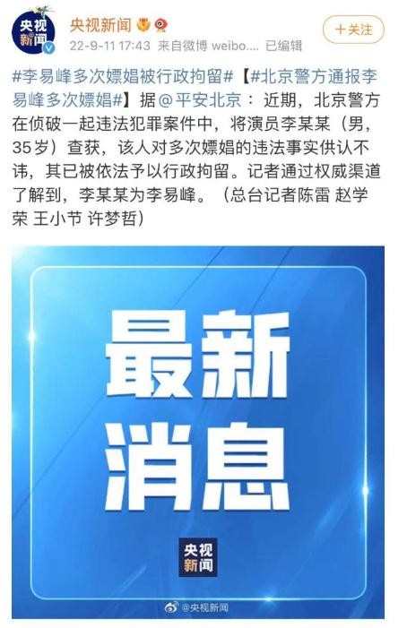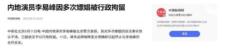 内地演员李易峰因多次嫖娼被行政拘留 中国新闻网2022-09-12