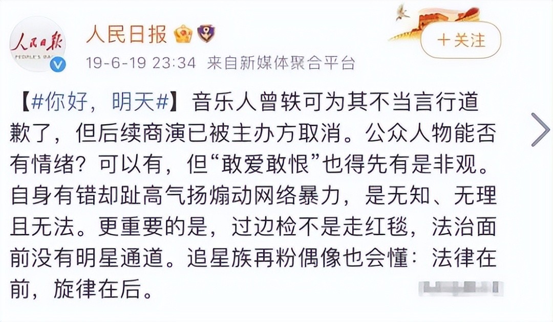 人民日报再评曾轶可事件:法治面前没有明星通道 上游新闻 2019-06-20