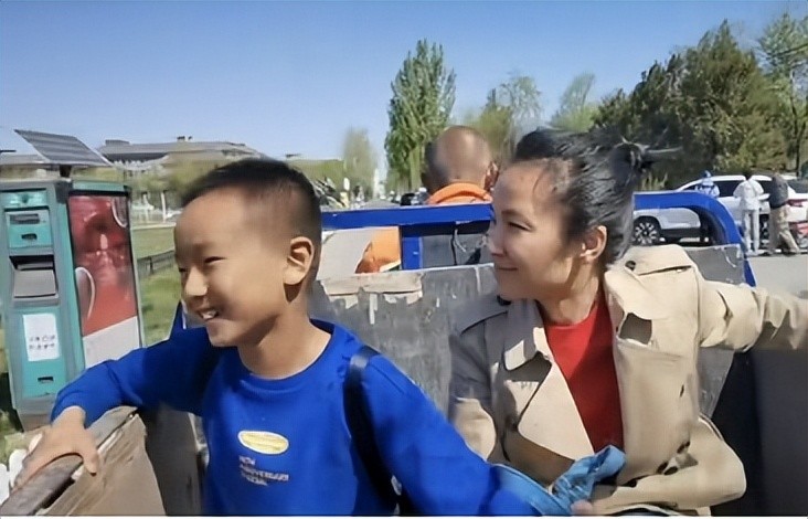 管彤还和儿子一同坐着三轮车,现身菜市场买菜。