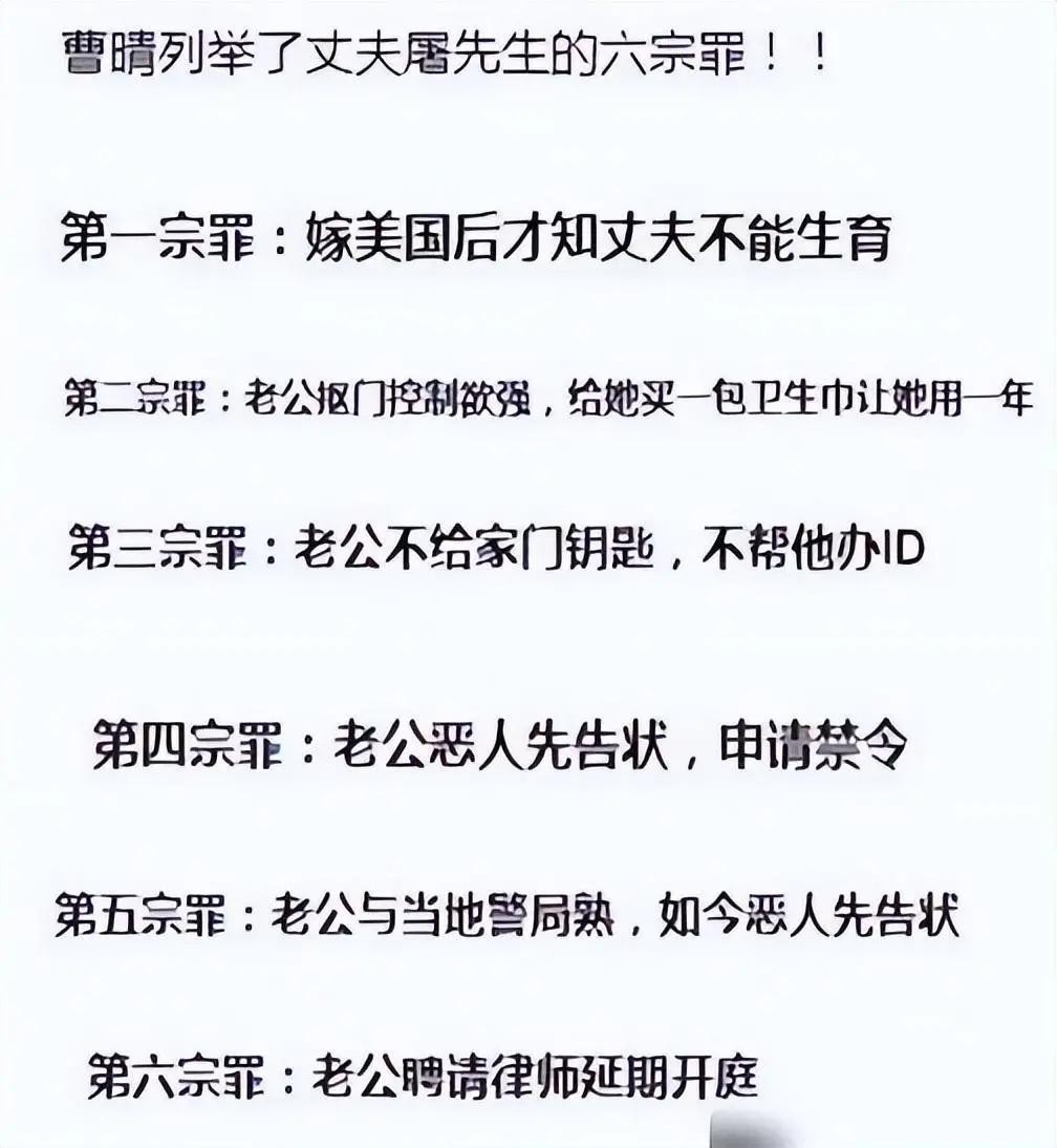 在这段痛苦的婚姻中,曹晴感到孤立无援,她的身心受到了极大的伤害。2017年,曹晴终于无法忍受屠中恒的虐待,鼓起勇气将他告上了法庭。