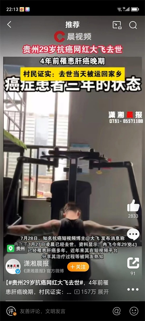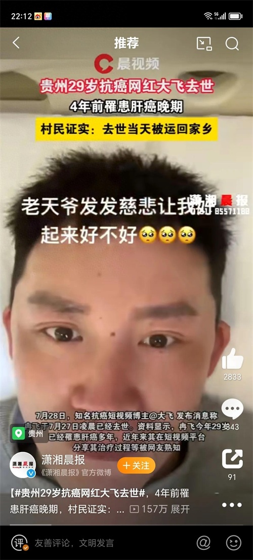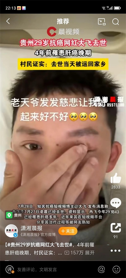 贵州29岁抗癌网红大飞离世,肝癌阴影下的青春消逝