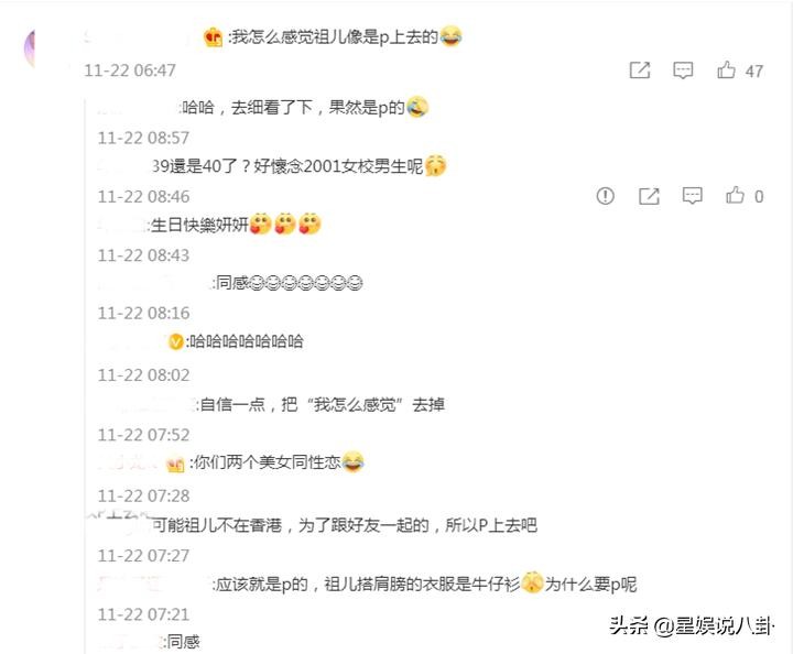 被P图上去的容祖儿引起了众多网友的关注,他们似乎都已经忘了生日的主角是阿Sa,纷纷留言求证,还有网友调侃阿娇称:“难道祖儿不用录制《我们的歌》了吗?”更有网友直言:“这图P得真不错,要不是知道鹅不在香港,我都要相信了。”