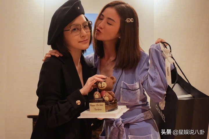 照片中,阿娇身披一件纯黑色的披风长外套,头戴黑色“贝雷帽”,一副正方形淡色眼镜,看上去更具成熟女性的韵味,手中拿着一款迷你版棕色小熊的生日蛋糕,面带微笑站在阿sa(蔡卓妍)的身边,而阿sa则身穿一袭淡蓝色的睡袍,过肩长发柔顺落于两侧,看得出是经过装扮后的模样,右手轻搭在阿娇的肩上,小嘴微嘟像是恋人模样,而左手提着的礼品盒应该也是姐妹阿娇送的生日礼物。