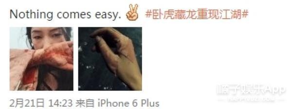 对于拍戏吃苦她倒是有一个好心态,发微博称:一切都来之不易(Nothing comes easy)后面还比了个剪刀手为自己打气。