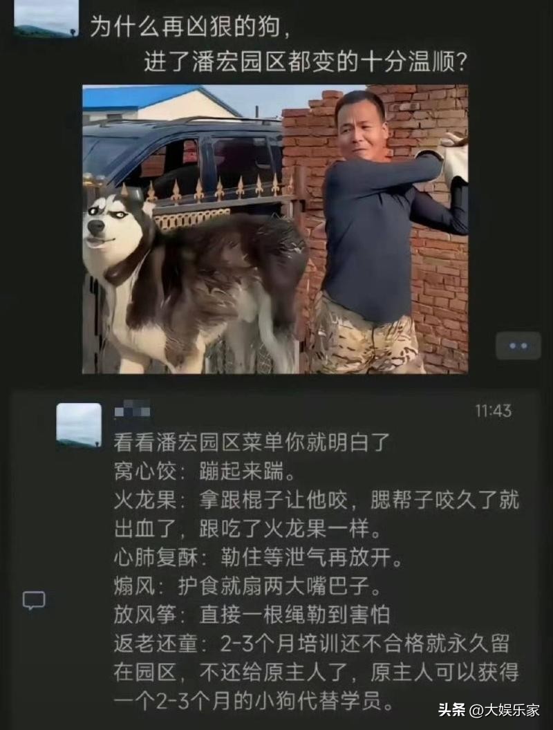 这名训狗师在直播界很出名,原因是号称可以驯服所有恶劣的狗狗,潘宏园区的狗都是这类问题狗,但也有不少网友称潘宏不是驯狗而是在虐狗。