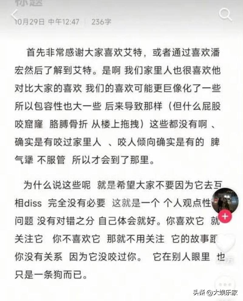 不过原主人曾经发文表示,送艾特去潘宏园区是因为它脾气坏,不服管,确实有咬人倾向,但并不是网传的这么严重。