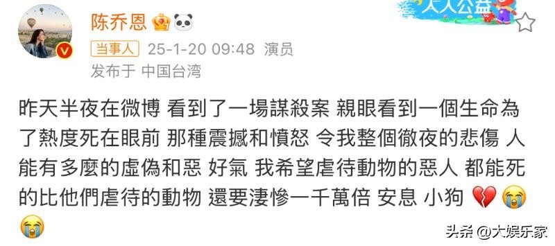 而陈乔恩两度为艾特发声,称:亲眼看到一个生命为了热度死在眼前。那种震撼和愤怒,令我整个彻夜的悲伤。