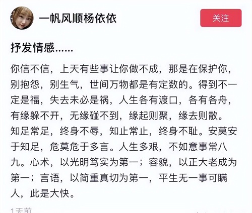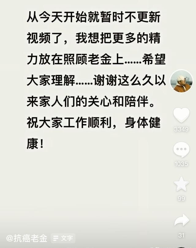 在老金生命的最后阶段,他和媳妇决定不再更新视频了,把所有时间用来陪伴彼此。杨依依在他走之前,还发了条感慨:世间万物都有定数,有些事做不成,可能是上天在保护你。你说这话,是不是听着特别有味道?