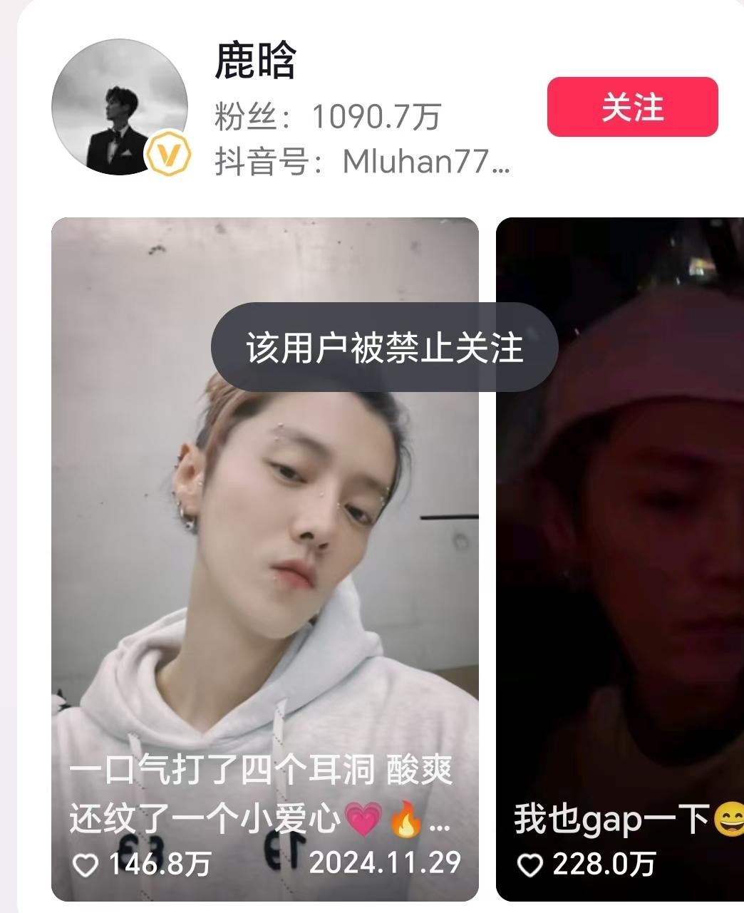 今(6)日下午,有网友发现,鹿晗的多个社交账号被禁止关注。