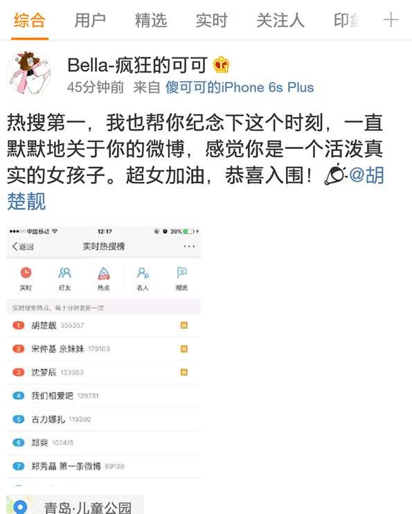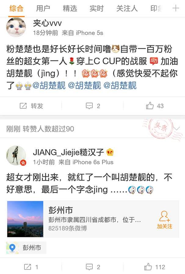 今天上午打开微博的人,会惊奇的发现一个叫胡楚靓的女生上了微博热搜榜第一名,原来这个女生是2016“超级女声”报名第一人,其本身也是拥有百万粉丝的网红。成为超女首个报名者,在参赛后被评委赞“有明星潜质”,并迅速上微博热搜第一,其粉丝为其点赞,加油!