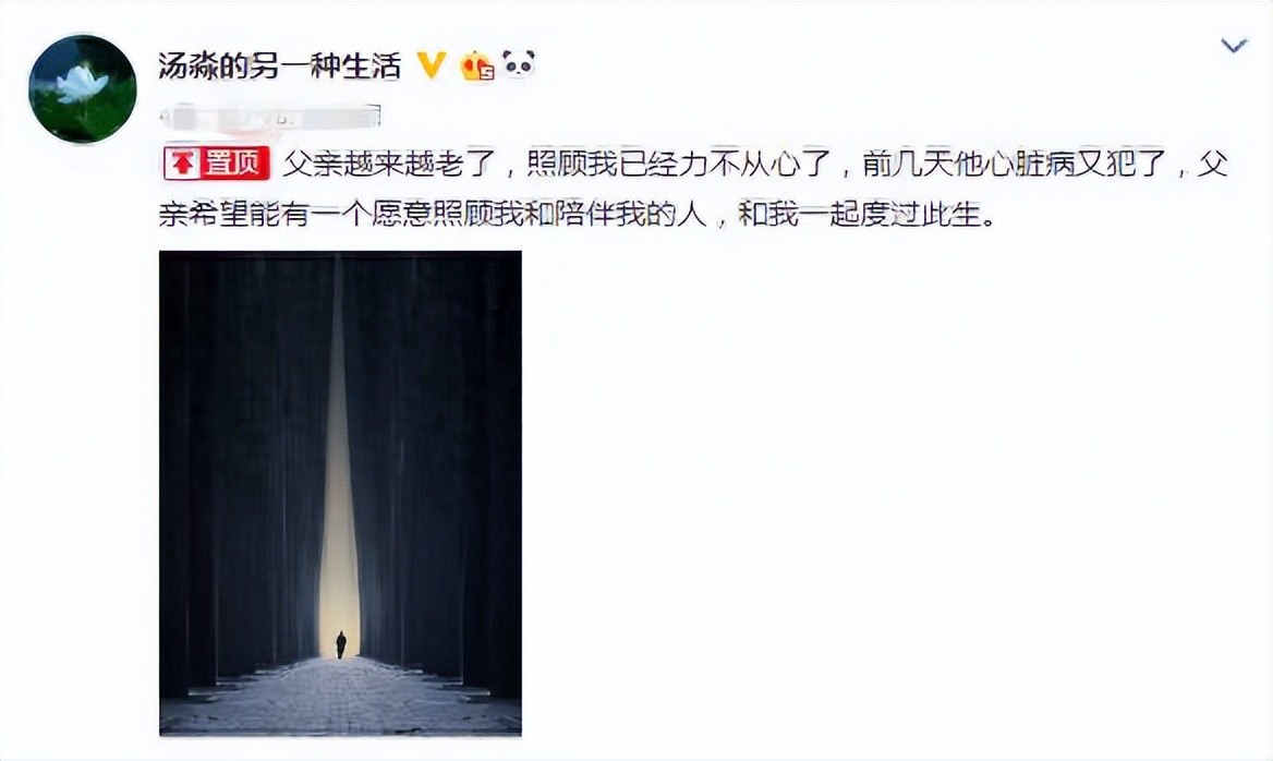 汤淼为了不再让父亲受苦,他曾在4月份在个人社媒上发起了征婚,内容写着:“父亲因为心脏病发作,已经无法照顾他了,父亲希望能找一个愿意照顾和陪伴我的人,共度余生”。