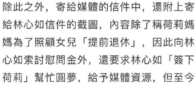 等到媒体曝光了她向林心如讨要慰问金,要求她和自己签约的信件内容,