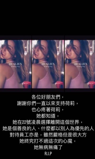 转天,她的团队就突然在社交平台上宣布荷莉已经自杀去世了。