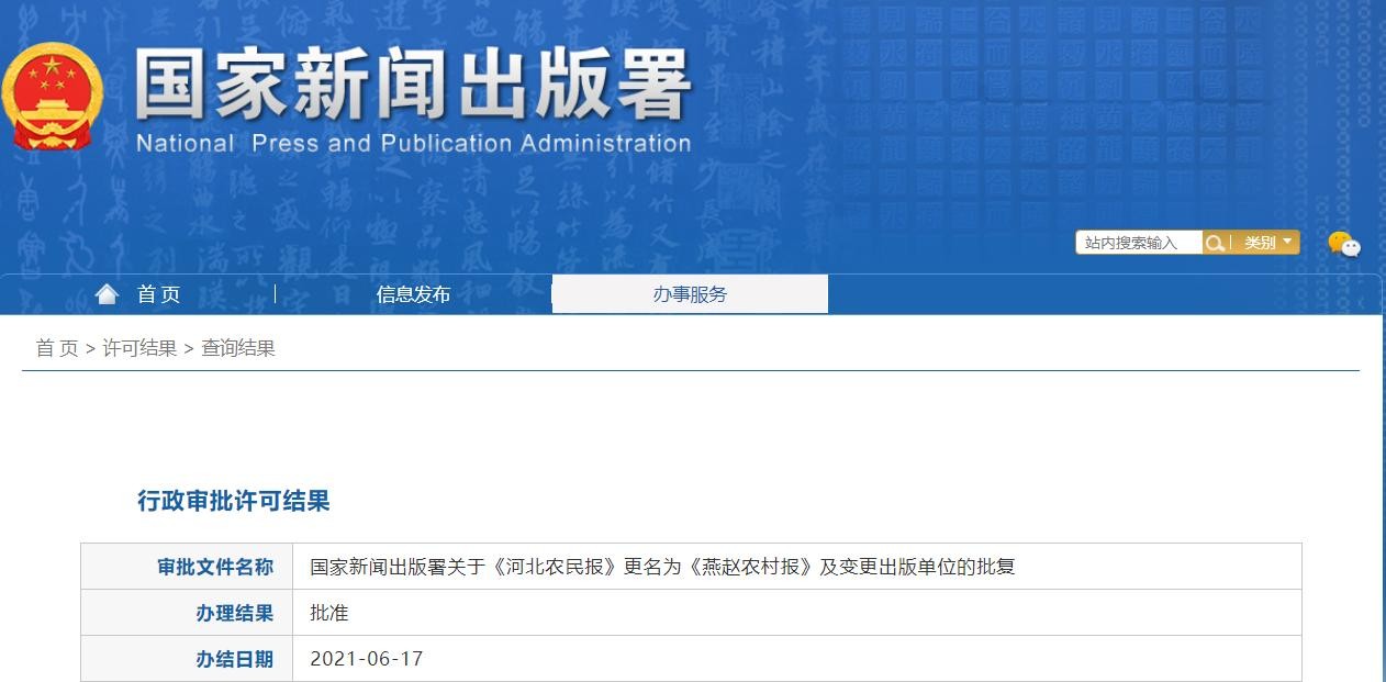 国家新闻出版署官网“行政审批许可结果”显示:《河北农民报》更名为《燕赵农村报》及变更出版单位的申请已获批准。