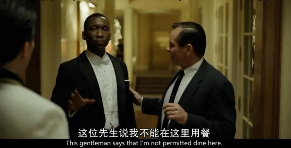 托尼与黑人钢琴家第一次见面的片段,导演就在拍摄角度和构图上精心雕琢了一番,钢琴家身着长袍,高高在上,托尼显得卑微渺小,在画面下方,两个人形成的对角线构图和位置高低的差异,充分凸显了二人身份地位的悬殊,彰显了影片造型语言上的魅力。