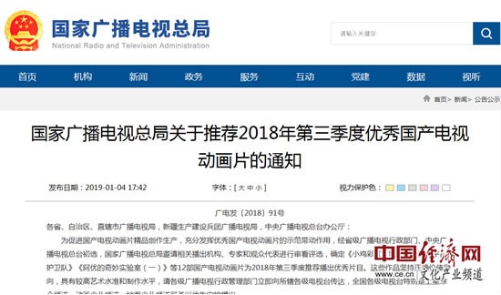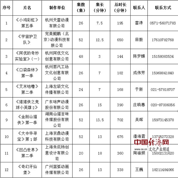 经济日报-中国经济网北京1月8日讯 近日,国家广播电视总局发布了关于推荐2018年第三季度优秀国产电视动画片的通知。通知表明,为促进国产电视动画片精品创作生产,充分发挥优秀国产电视动画片的示范带动作用,经省级广播电视行政部门、中央广播电视总台初选,国家广播电视总局邀请相关播出机构、专家和观众代表进行审看评选,确定《小鸡彩虹(第五季)》《宇宙护卫队》《阿优的奇妙实验室(一)》等12部国产电视动画片为2018年第三季度推荐播出优秀片目。