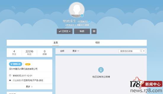 目前该微博还未发布任何信息,不过简介中非常明确地写出了“《绝地求生》国服官方微博”,同时也有企业微博认证,一旁显示为深圳市腾讯计算机系统有限公司。可以确定这就是国服官微了。