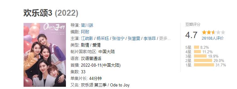 但《欢乐颂3》显然没有符合观众的预期,狗血味浓郁,人物塑造过于悬浮,以至于豆瓣评分仅有4.7分,创下这个系列剧最低成绩,甚至对于一番女主江疏影的路人缘也有所影响。