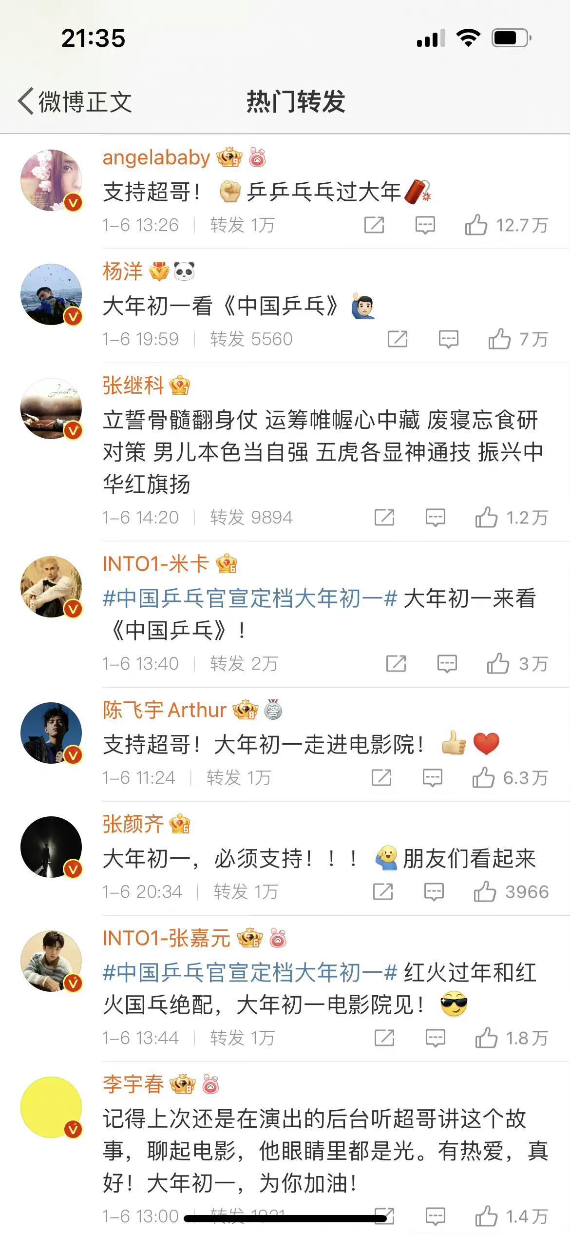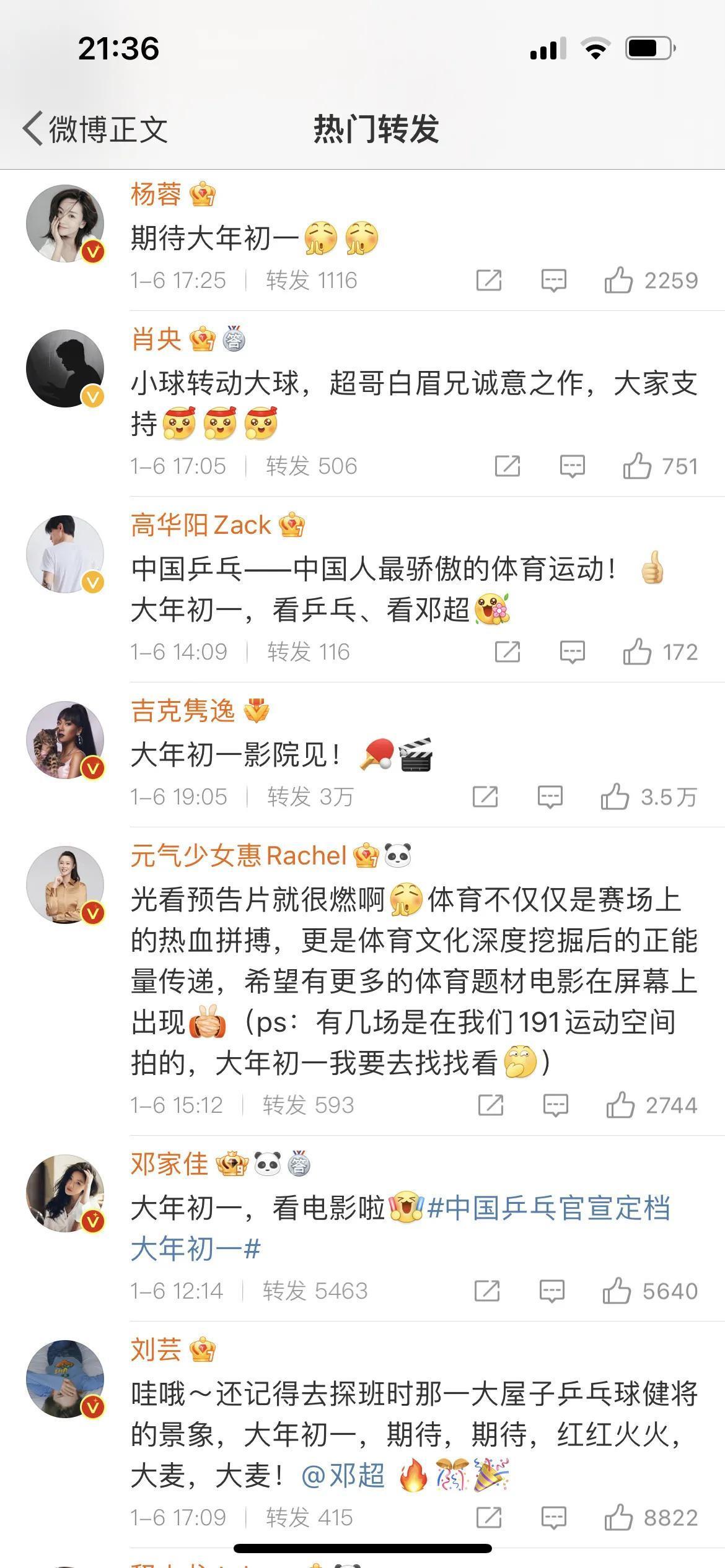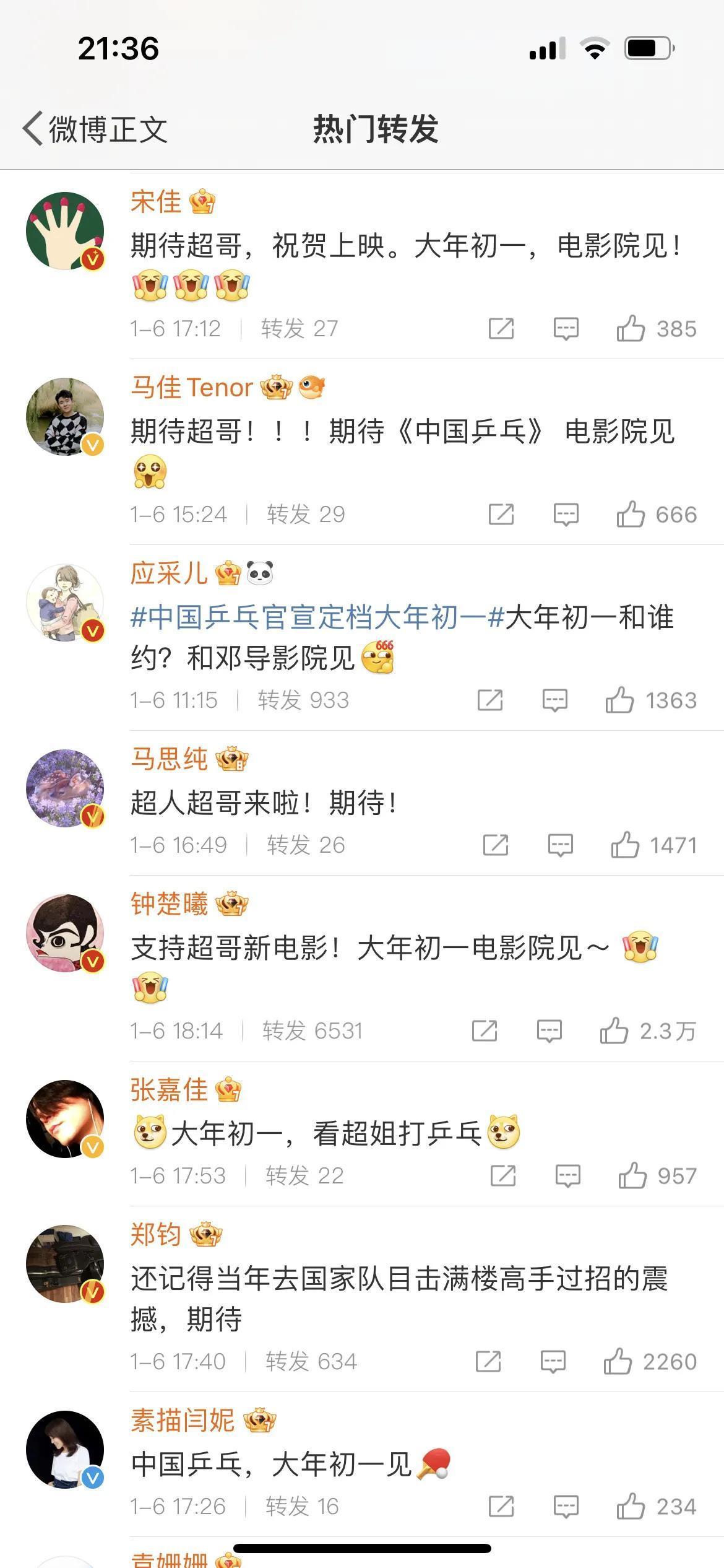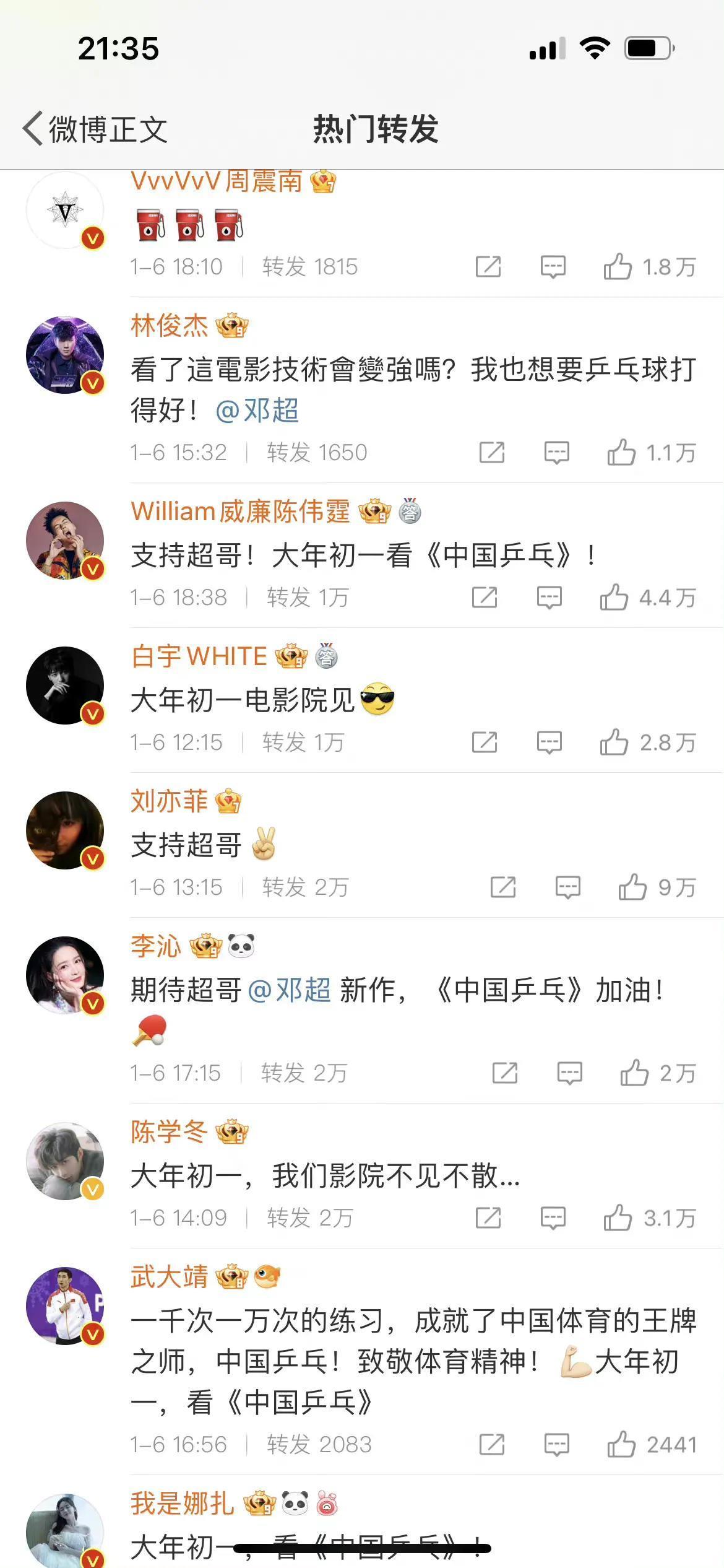 而在邓超转发了预告之后,,马思纯、迪丽热巴、刘昊然、檀健次、蔡徐坤,鹿晗,杨紫,龚俊,刘诗诗,关晓彤,王源,张艺兴,朱一龙,angelbaby,杨洋,李宇春,陈飞宇,刘亦菲,陈伟霆,薛之谦等一线打牌明星纷纷帮忙转发,初步数了下,好像有112位明星祝贺并发文表示支持,就连职业乒乓运动员邓亚萍,张继科也表示期待邓超的新电影。