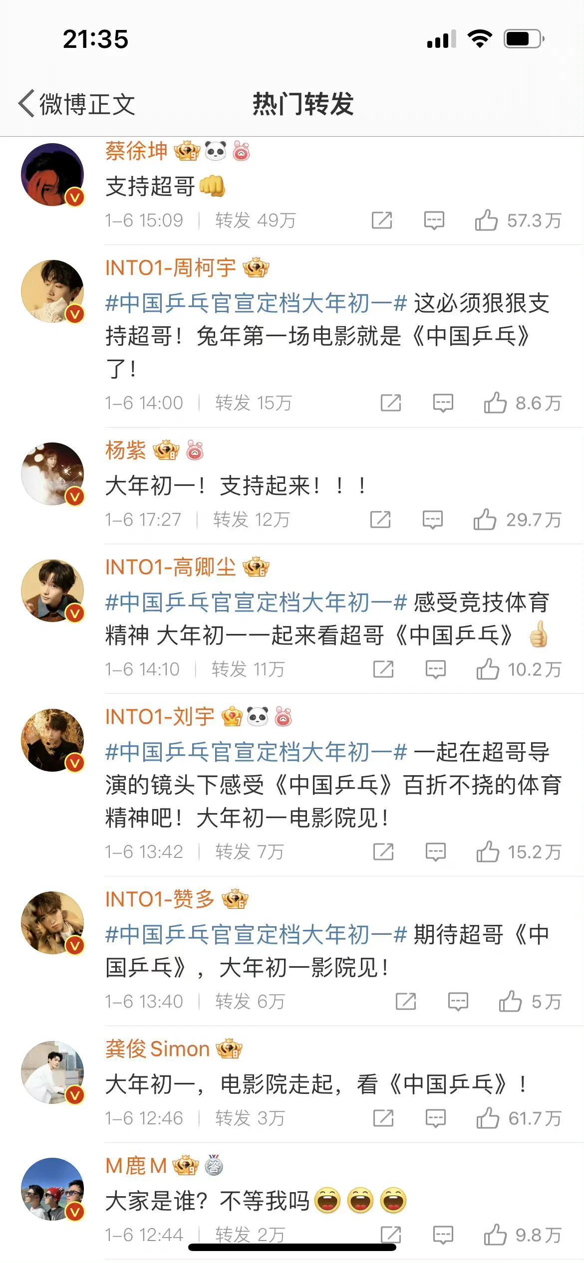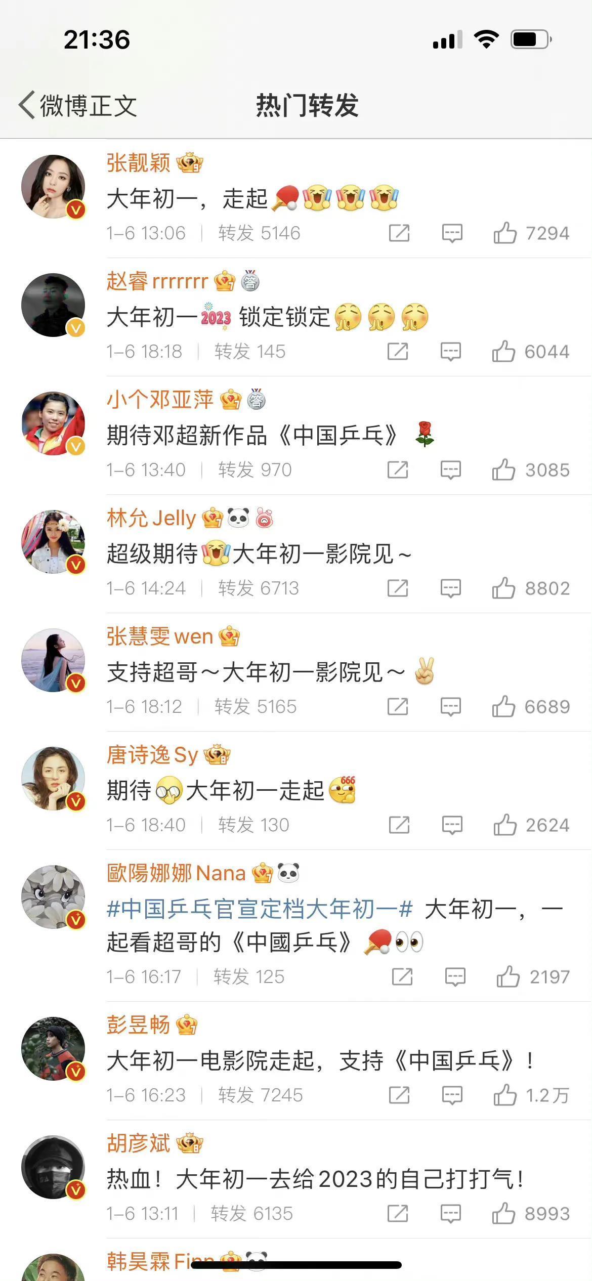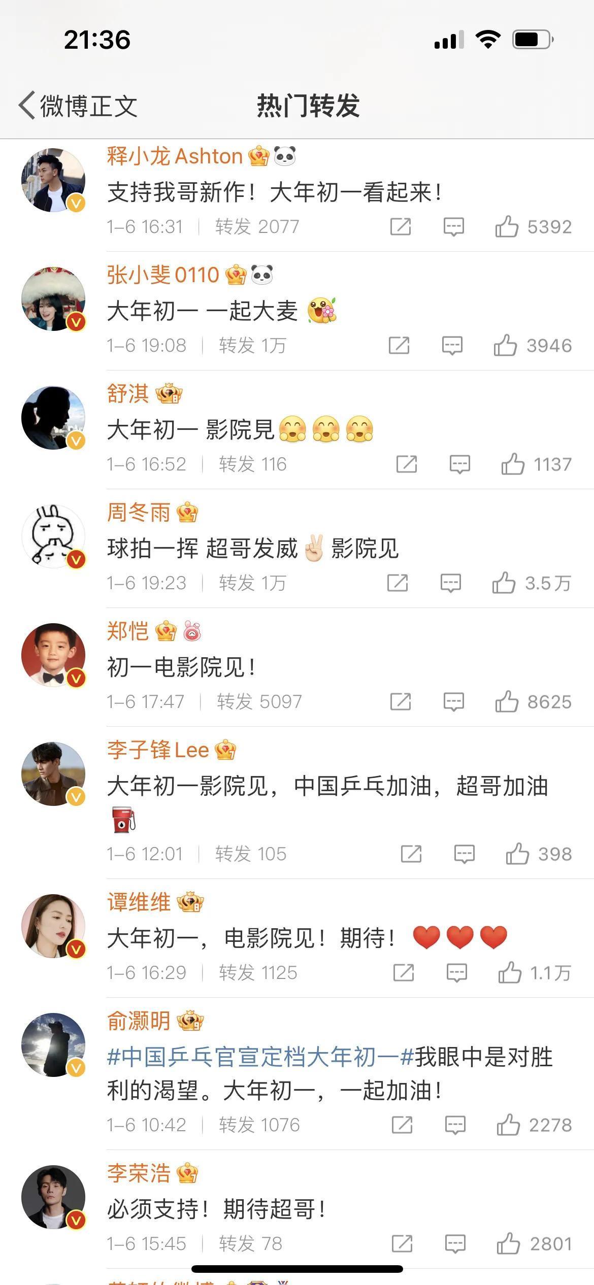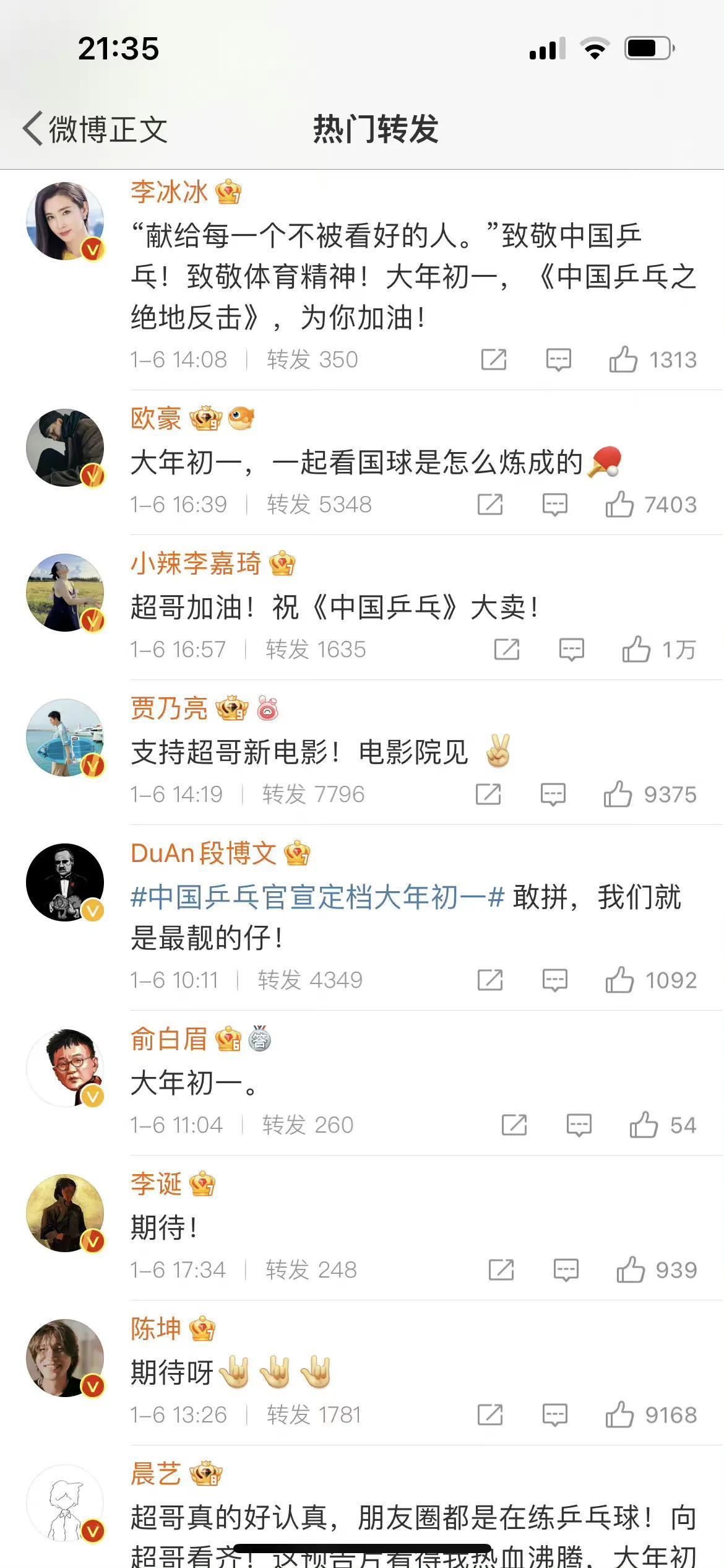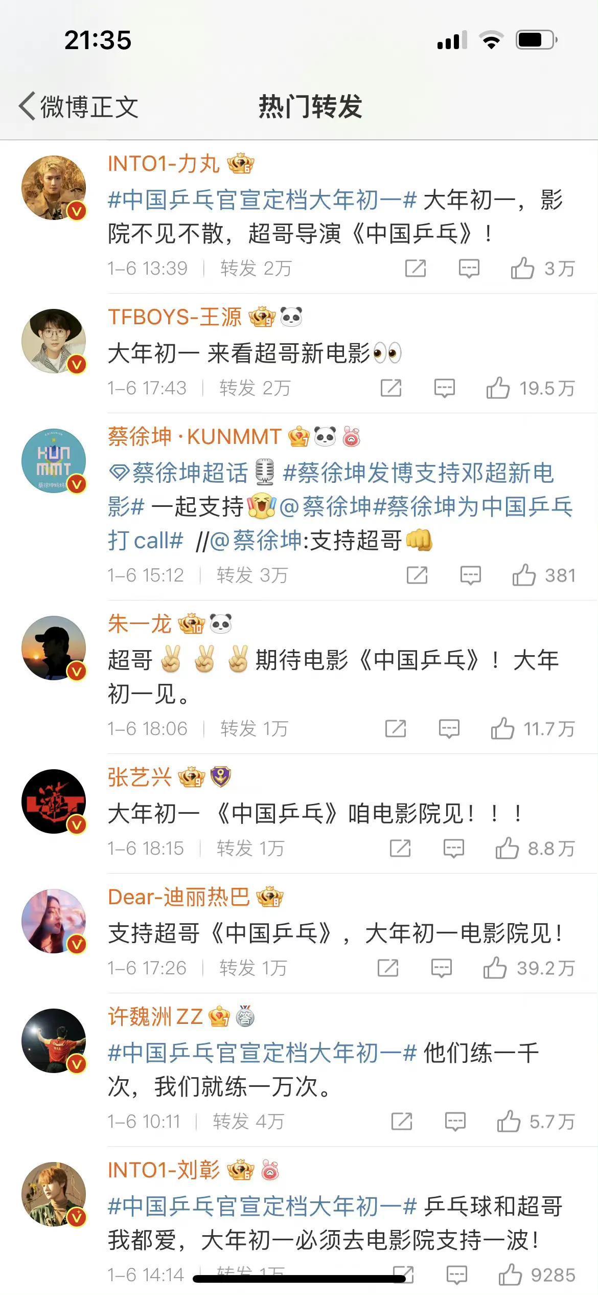 而在邓超转发了预告之后,,马思纯、迪丽热巴、刘昊然、檀健次、蔡徐坤,鹿晗,杨紫,龚俊,刘诗诗,关晓彤,王源,张艺兴,朱一龙,angelbaby,杨洋,李宇春,陈飞宇,刘亦菲,陈伟霆,薛之谦等一线打牌明星纷纷帮忙转发,初步数了下,好像有112位明星祝贺并发文表示支持,就连职业乒乓运动员邓亚萍,张继科也表示期待邓超的新电影。