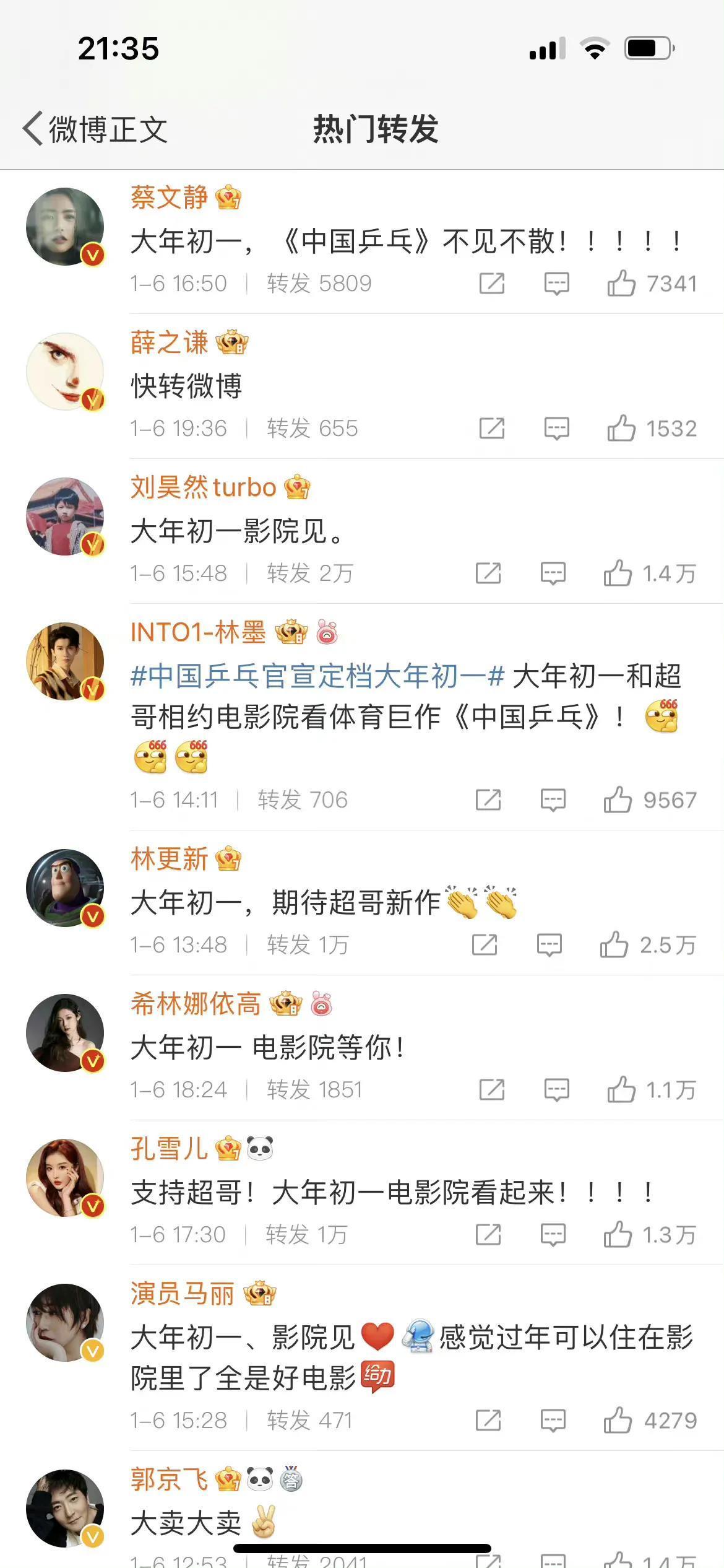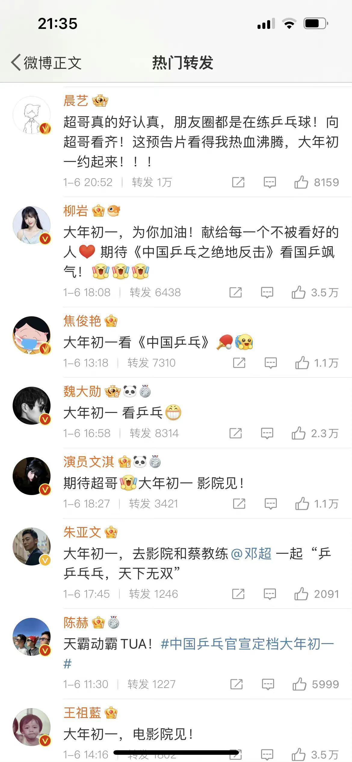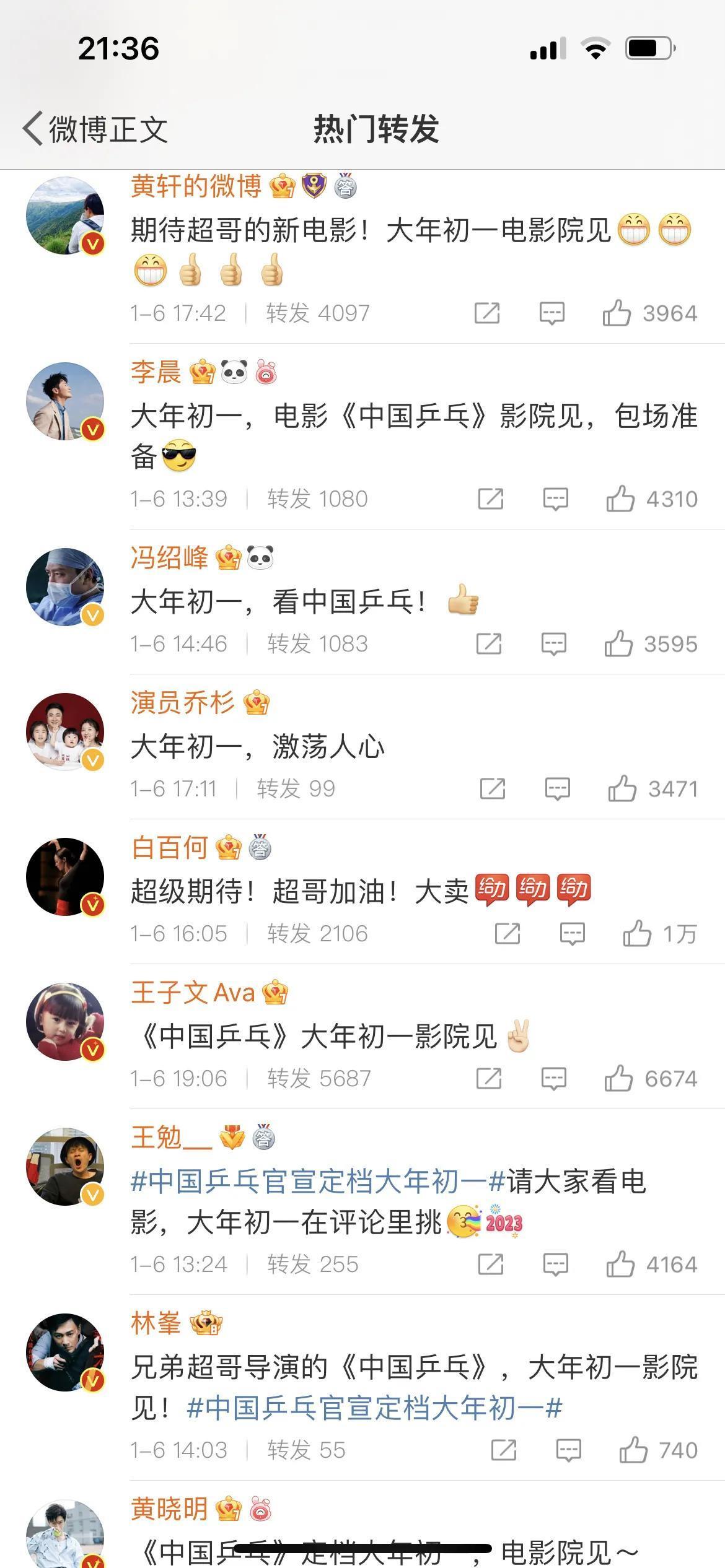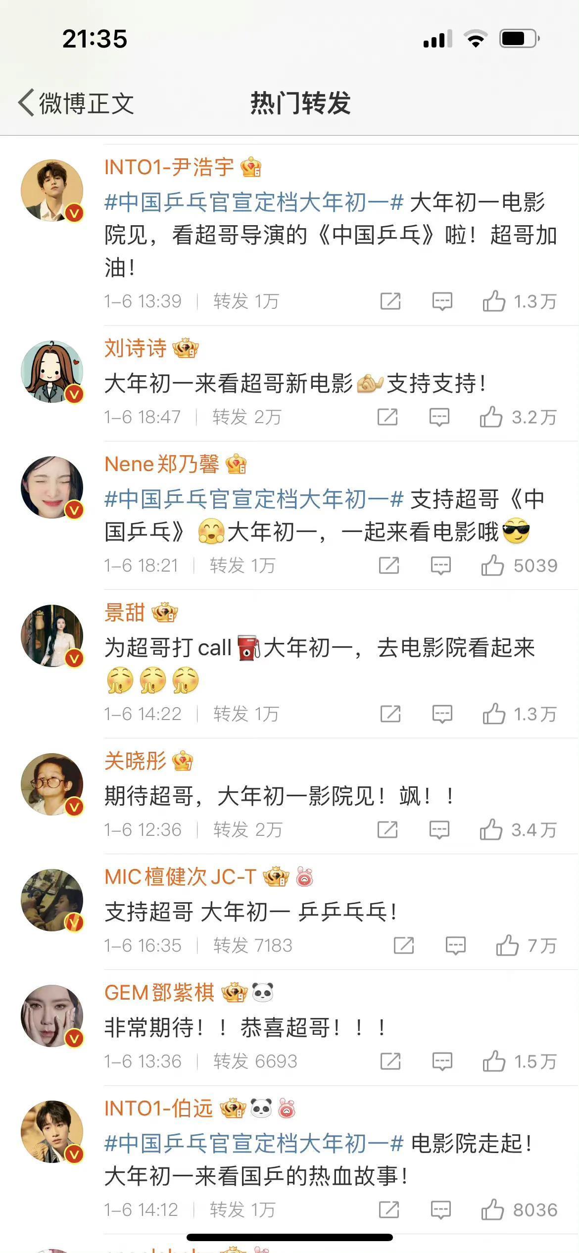 而在邓超转发了预告之后,,马思纯、迪丽热巴、刘昊然、檀健次、蔡徐坤,鹿晗,杨紫,龚俊,刘诗诗,关晓彤,王源,张艺兴,朱一龙,angelbaby,杨洋,李宇春,陈飞宇,刘亦菲,陈伟霆,薛之谦等一线打牌明星纷纷帮忙转发,初步数了下,好像有112位明星祝贺并发文表示支持,就连职业乒乓运动员邓亚萍,张继科也表示期待邓超的新电影。