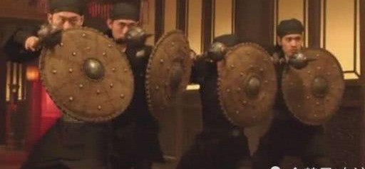金瓜锤可劈砸,断骨裂筋。藤盾可防护、冲击。但是这两种兵器搭配在一起很奇怪,砸击力量型的兵器需要大开大合,但是藤盾需要防护遮挡,寻求空隙以攻击。所以多以刺击、割划类的兵器搭配,达到以最小的动作造成最大的杀伤的目的。片中的这种配置不适合战阵,有点生硬。