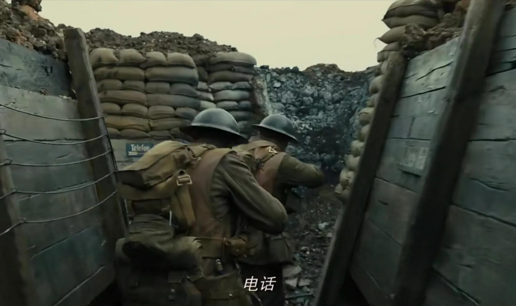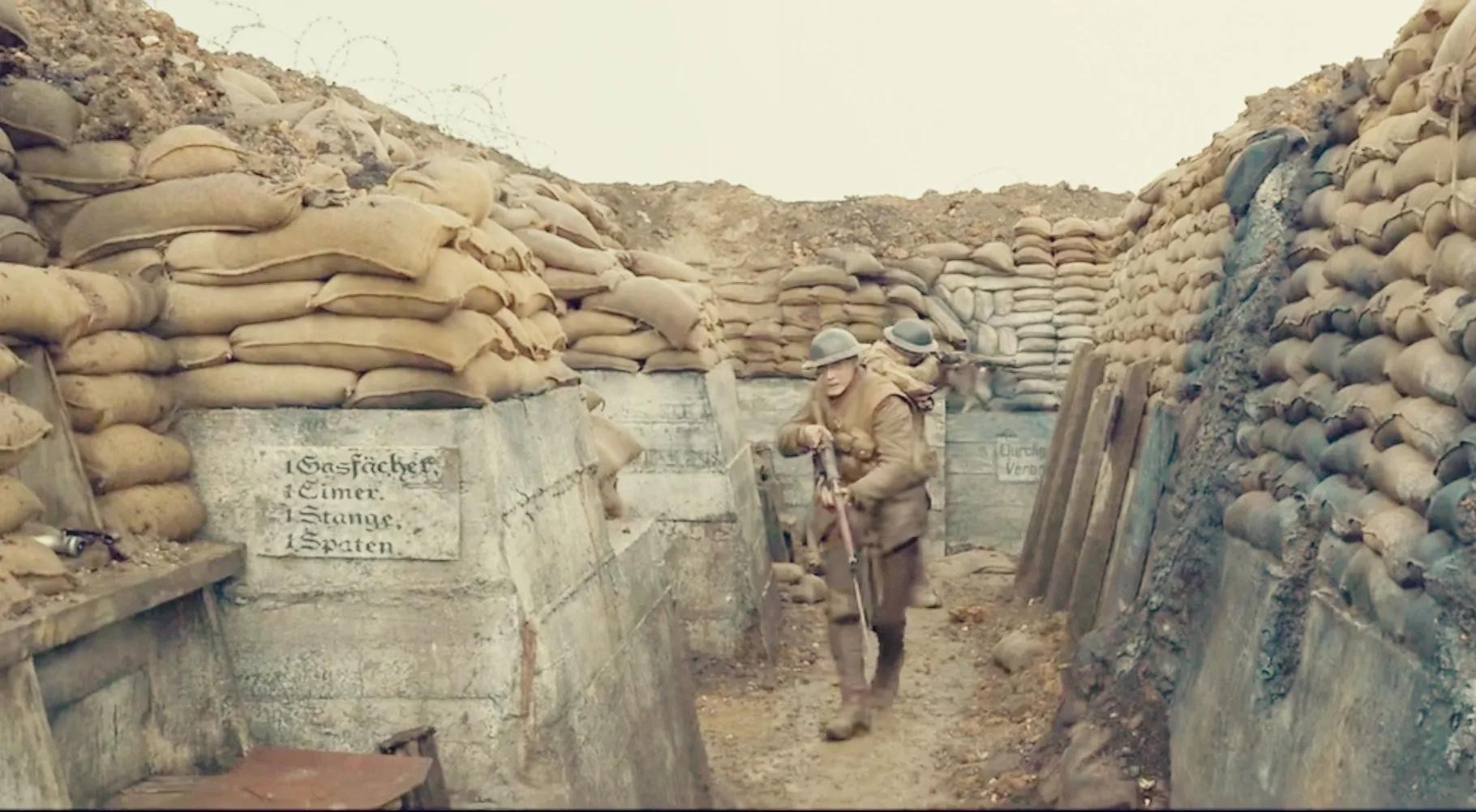 没有很多战斗的场景,但是通过两个士兵的视角,我们看到了很多战斗留下来的痕迹,那些弹坑,残缺的无名尸体,还有老鼠,有些地面变成了泥沼地,里面藏着死尸,水还有泥巴,陷进去可能就出不来了。又宽又长的战壕里,没有一个士兵,士兵都撤走了,其中也隐藏着危险。想想战斗的时候,壕沟上都是士兵,双方相关射击,开炮,几分钟几千条生命就报销了,那是有多惨烈。
