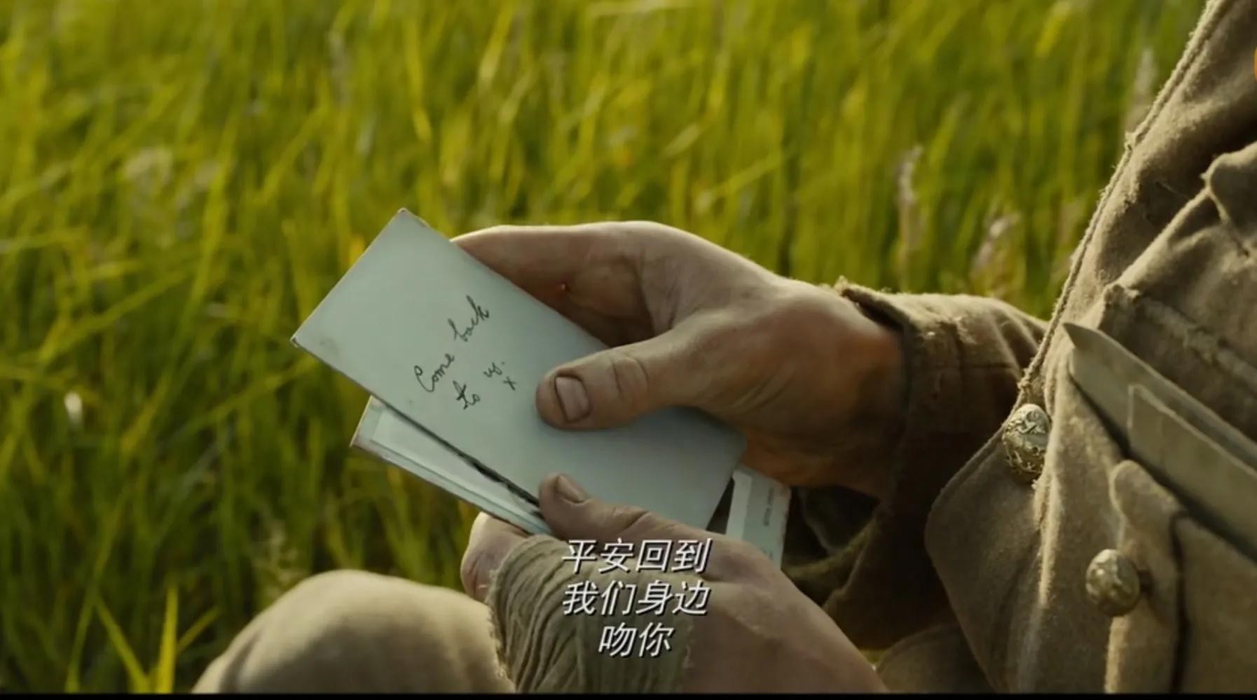 影片最后也展示了一群受伤的士兵接受治疗的场景,看了让人害怕,战争是残酷的。斯科菲尔德坐在一棵树旁边,看了手中的照片,他闭上眼睛,或许在沉思,这场战争什么时候结束。