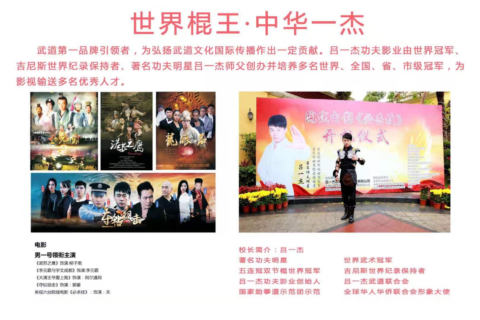 吕一杰功夫影业由五连冠双节世界冠军,吉尼斯世界纪录创造者、保持者,著名功夫明星吕一杰师父创办,并培养多名世界、全国、省市级冠军,为影视界输送多名优秀人才。