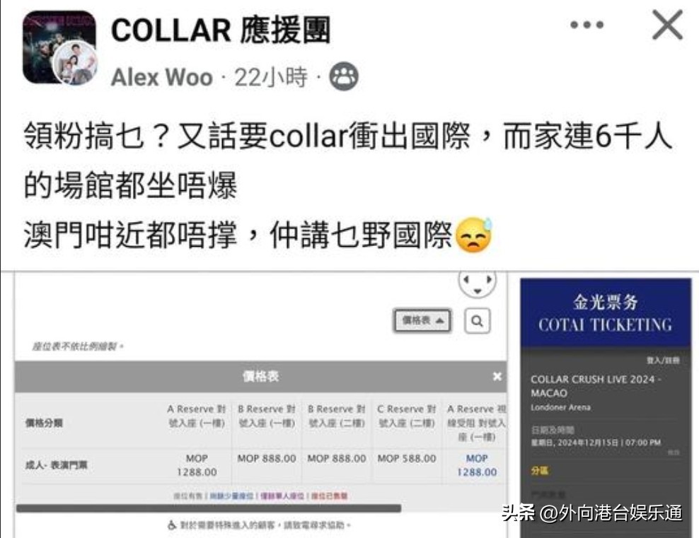 在这种情况下,COLLAR的演唱会行情不容乐观。据悉,COLLAR即将在澳门伦敦人综艺馆举办的演唱会,几千张门票至今还未售罄,打入外地市场的策略受到严重打击。要知道,澳门距香港仅几十公里,很多港星的外地演唱会首站都会选择该地,以方便香港粉丝随时买票撑场,而COLLAR连这里都出师不利,粉丝的支持程度可想而知。