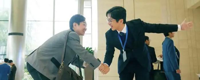 连人事经理马杰(白客 饰)给胡建林办入职时,都要弯腰鞠躬笑嘻嘻地说:
