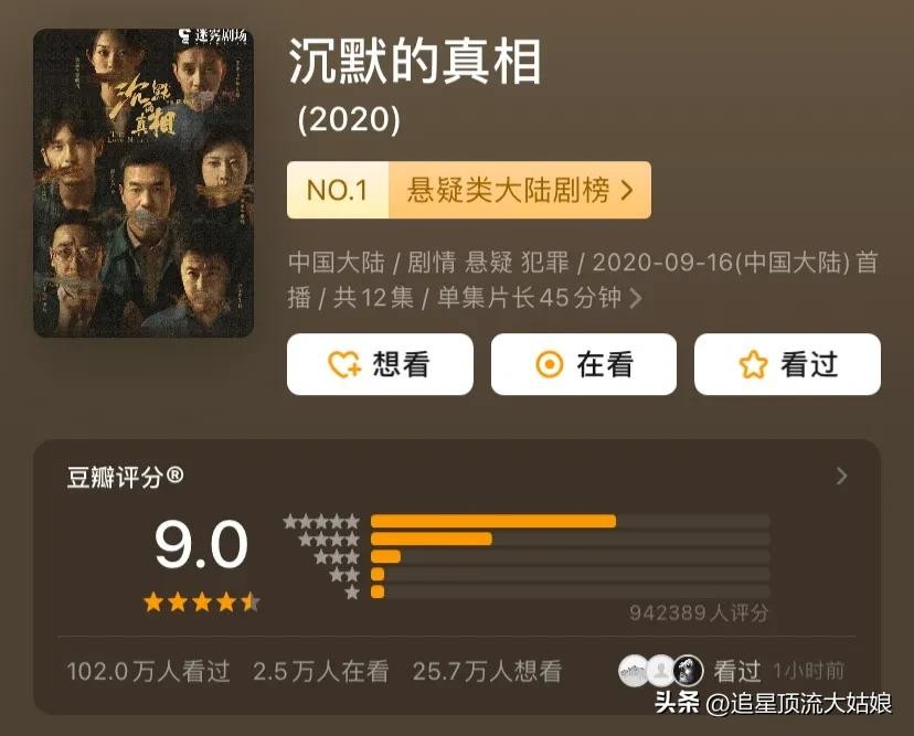 《沉默是真相》2020年在爱奇艺“迷雾剧场”播出,豆瓣评分9.0分。这部剧有众多实力演员加盟,廖凡、白宇、谭卓、宁理、黄尧、赵阳、田小洁、王建国主演的现代悬疑剧。
