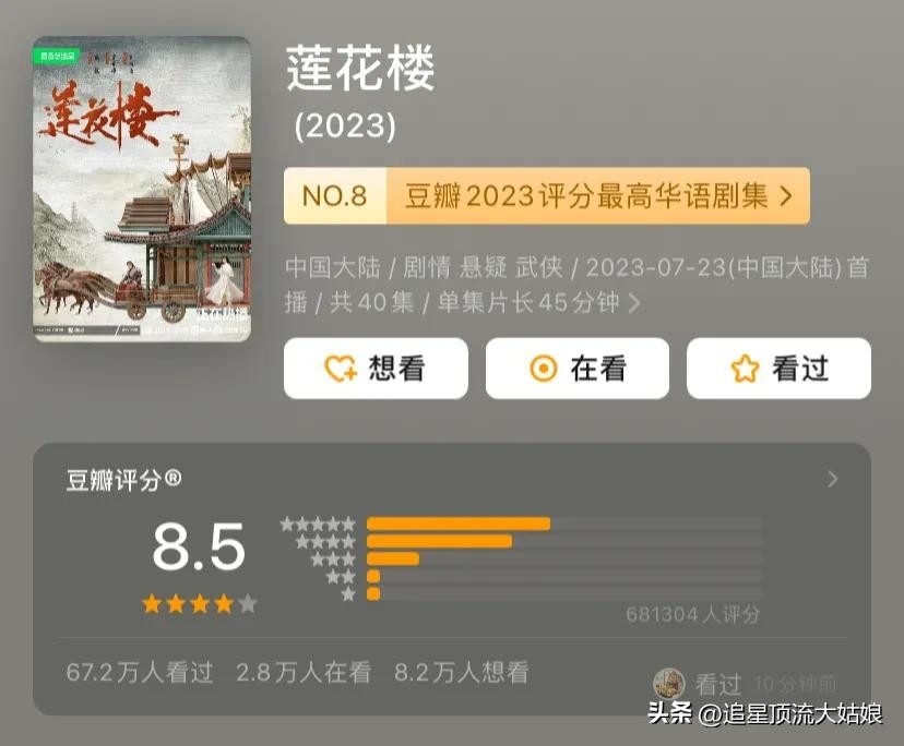 《莲花楼》2023年在爱奇艺播出,豆瓣评分8.5分。由新晋顶流成毅、曾舜晞、肖顺尧、陈都灵、王鹤润、陈意涵主演的古装悬疑探案。
