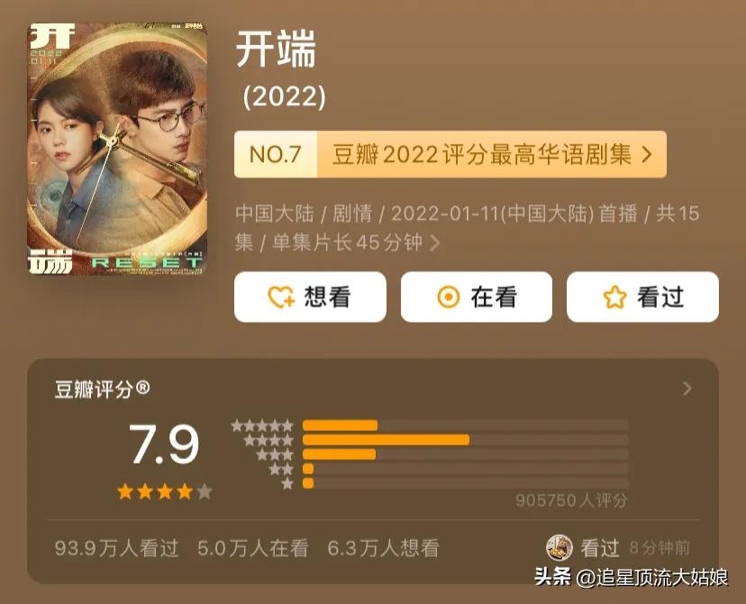 《开端》2022年在腾讯视频播出,豆瓣评分7.9分。由新晋90后扛剧小生白敬亭、赵今麦、刘奕君、黄觉、刘丹主演的悬疑时空循环剧。