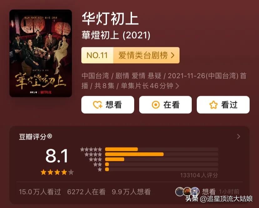 《华灯初上》连奕琦执导,2021年在奈飞播出,豆瓣评分8.1分。由林心如、杨谨华、谢欣颖、刘品言、郭雪芙、凤小岳、杨祐宁、江宜蓉、霍建华主演的悬疑推理剧。