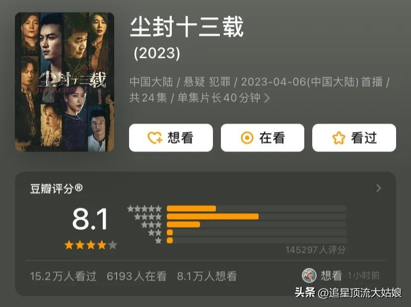《尘封13载》2023年在爱奇艺播出。豆瓣评分8.1分。由陈建斌、陈晓、啜妮主演的刑侦悬疑剧。