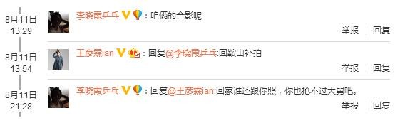 8月11日,王彦霖发了一条微博并且艾特了奥运冠军李晓霞,暴露了两人的亲戚关系。两人都是辽宁鞍山人,但王彦霖只是称李晓霞为姐姐,并没有回应两人到底是何种亲戚关系。