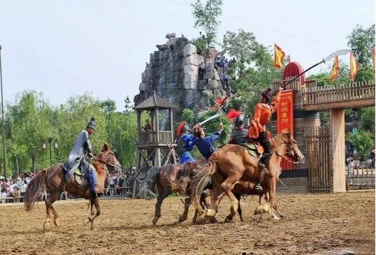 看完皮影跑快点,这个很精彩,是真的马战,岳飞超酷,在校场上骑着马打仗超酷