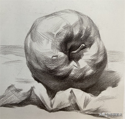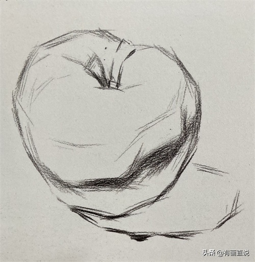 步骤2:找出苹果的明暗交界线以及投影的形状、位置、大小。注意线条的粗细、轻重、虚实变化(用笔的侧锋去画)。用斜排线统一画出苹果的暗面,让画面产生基本的明暗关系。
