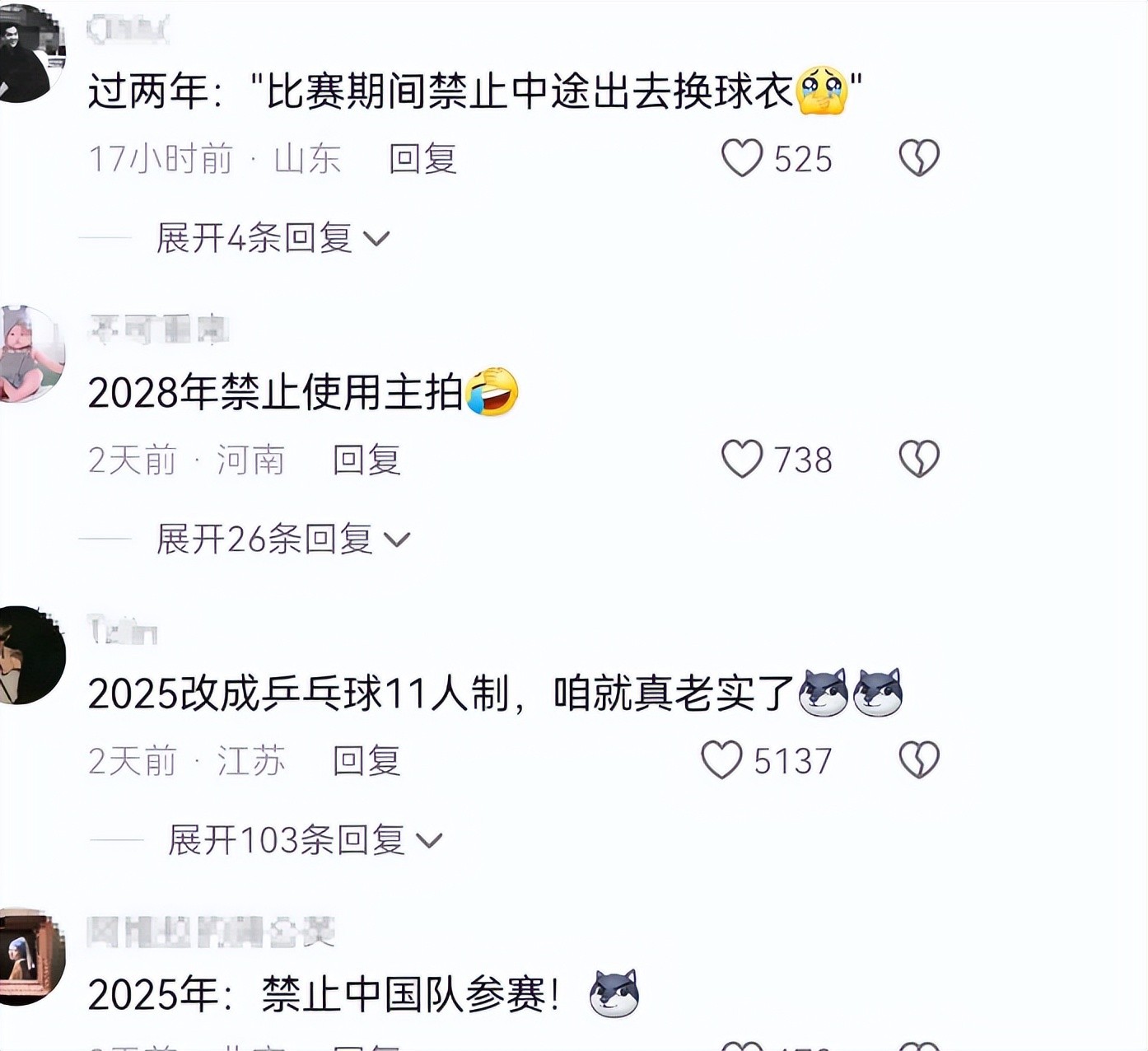 还有网友提议:说比赛期间禁止中途出去换球衣,难道就被马龙和樊振东换球衣给打怕了吗?乒乓球的规则变来变去我们也能接受,但是不换球衣就是身上难受啊。还有网友说2025年禁止中国队参赛,这个规则估计通过不了,不好改啊!