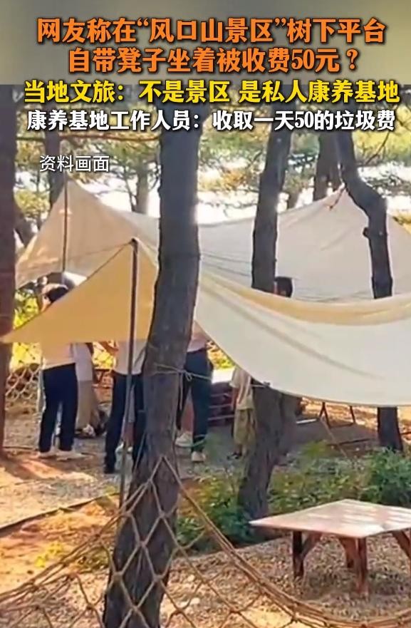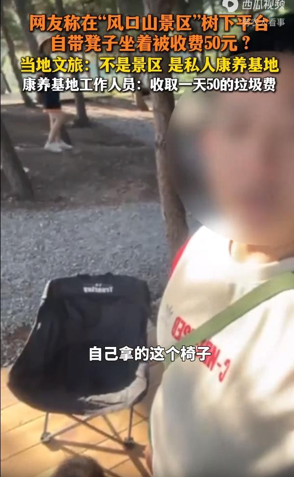 一男子去疗养基地游玩,在树底下乘凉却被要求收费50元,无奈之下男子只能再换个地方,没想到其他地方也是收费50元。自己的带的板凳,还不能在树下凉快了,这疗养基地谁还敢去啊。基地负责人回应说,有不收费的长凳子他不坐,我们怎么办。