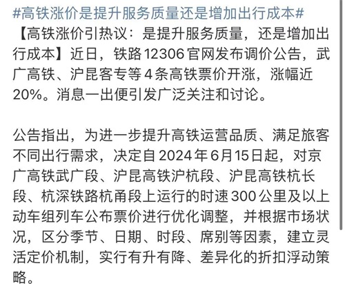 近日,铁路12306的官网发布调价公告,将对京广高铁武广段、沪昆高铁沪杭段、沪昆高铁杭长段、杭深铁路杭甬段上运行的时速300公里及以上动车组列车公布票价进行涨价,涨幅约为20%。这一决定立即引起了社会各界的广泛关注和热议。