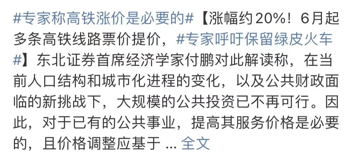 总之此次高铁票价的调整引起了社会各界的广泛关注和热议。虽然涨幅较大让一些乘客感到难以接受但铁路部门表示这是为了进一步提升高铁运营品质和满足旅客不同出行需求所做出的必要调整。他们将继续加大对高铁设备的投入和维护力度提高服务质量为旅客提供更加优质的出行体验。希望大家理性看待票价调整问题。毕竟不理解我们也改变不了啥。