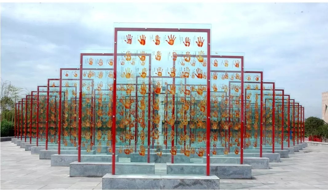 占地3000平方米的老兵手印广场,采集了7440枚抗战老兵的手印,将其放大1.2倍后印在钢化玻璃上,旁边刻上老兵的姓名、部队番号和职务。广场旁的石碑上刻着“国人至此,低头致敬”