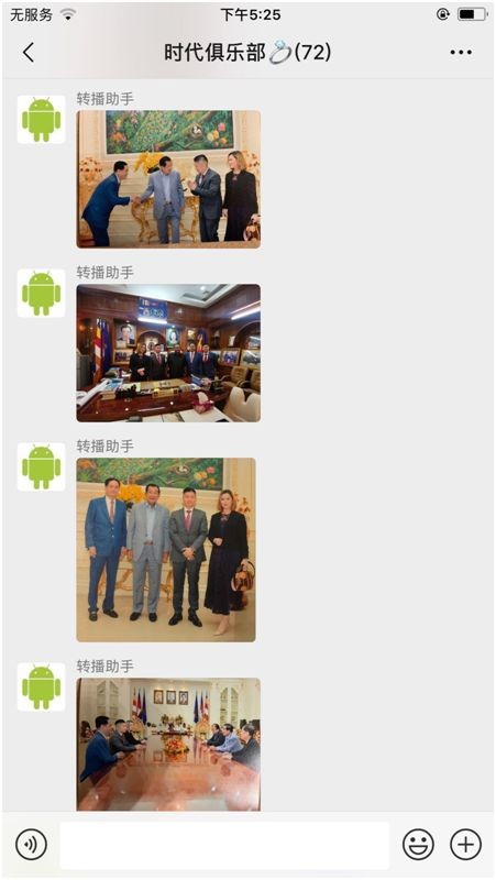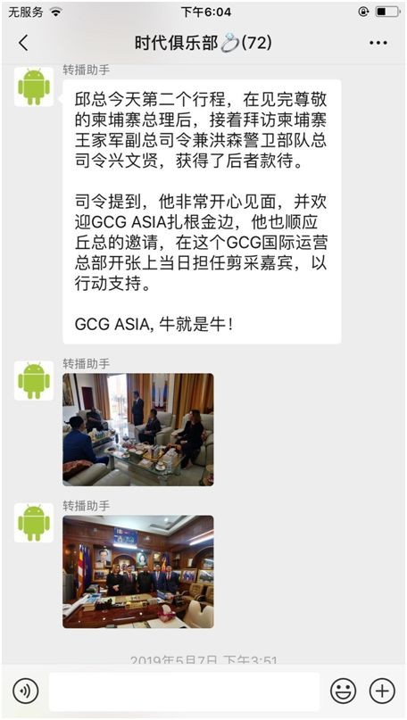 5月7日,在记者暗访的微信群中,一个名为“转播助手”工作人员直播发了一名自称邱总的人物,正拜访柬埔寨国家总理的图片和视频,并称“GCG ASIA鉅富金融”在柬埔寨的发展得到总理洪森的支持。