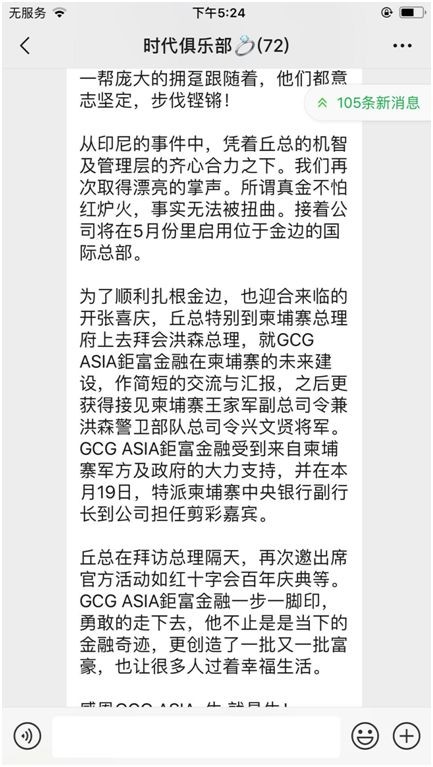 “为了顺利扎根金边,也迎合来临的开张喜庆,丘总特别到柬埔寨总理府上去拜会洪森总理......GCG ASIA鉅富金融受到来自柬埔寨军方及政府的大力支持...... GCG ASIA鉅富金融一步一脚印,勇敢地走下去,他不止是是当下的金融奇迹,更创造了一批又一批富豪,也让很多人过着幸福生活。”