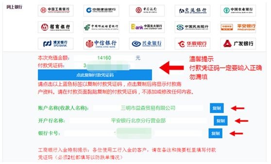 记者首次尝试在PTF平台入金,显示收款账户名称为三明市益森贸易有限公司。在记者的反复尝试过程中,跳转出多个不同的收款公司。